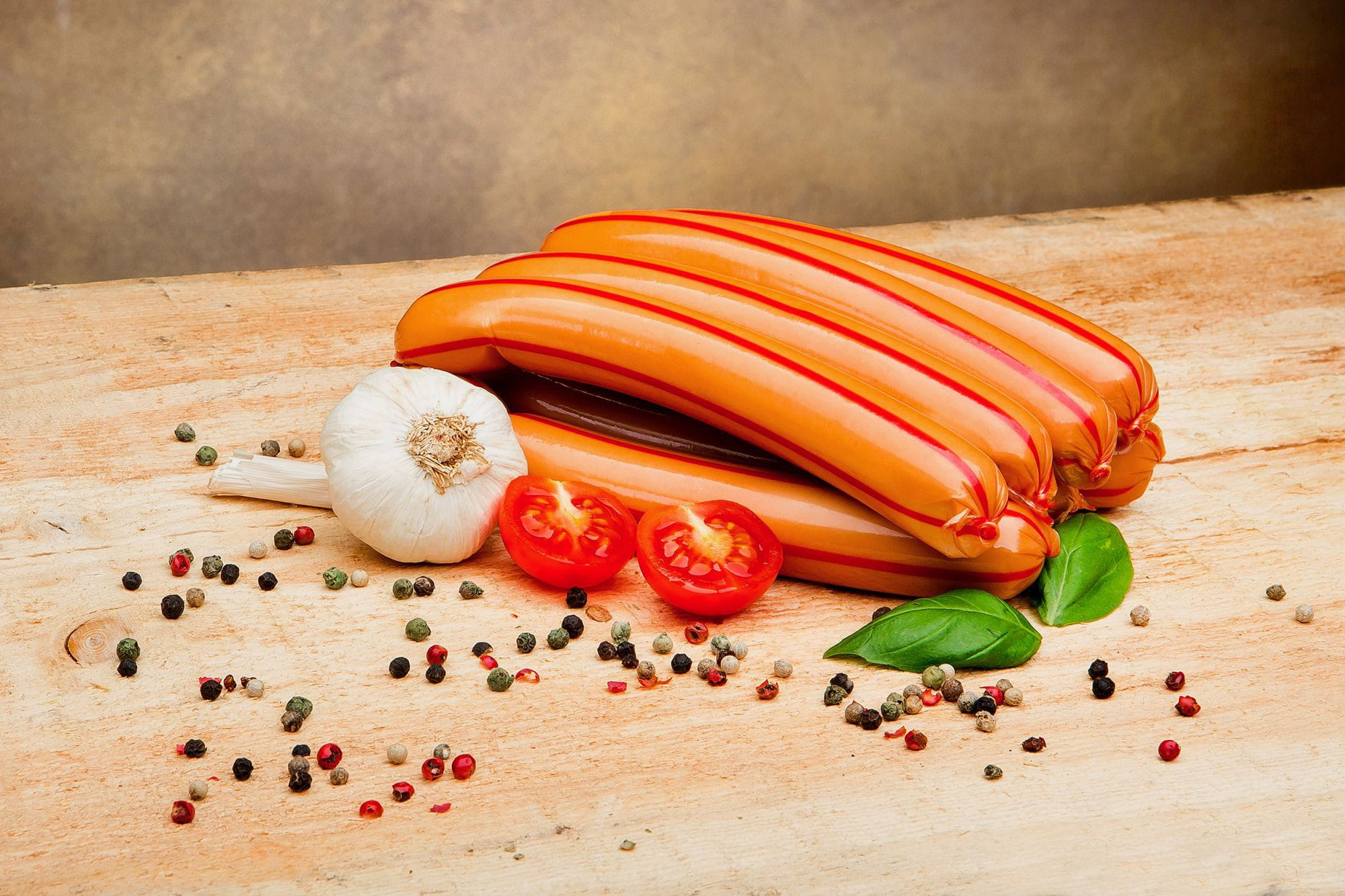 Kiełbasa drobiowo-wieprzowa, homogenizowana wędzona, parzona, z dodatkiem białka wieprzowego i białka mleka.