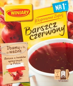 nr 1*, po prostu dobre!, suszone z dbałością, z polskich buraków, *Nestle za NielsenIQ, produkt Winiary Ekspresowa Zupa Barszcz Czerwony 60 g osiągnął najwyższą sprzedaż w kilogramach wśród produktów markowych, Panel Handlu Detalicznego, Cała Polska z Dyskontami (Food), sprzedaż wolumenowa w kg, okres skumulowany od VI 2020 do V 2021, kategoria: zupy, segment: zupy suche w torebkach (klasyfikacja własna klienta)
